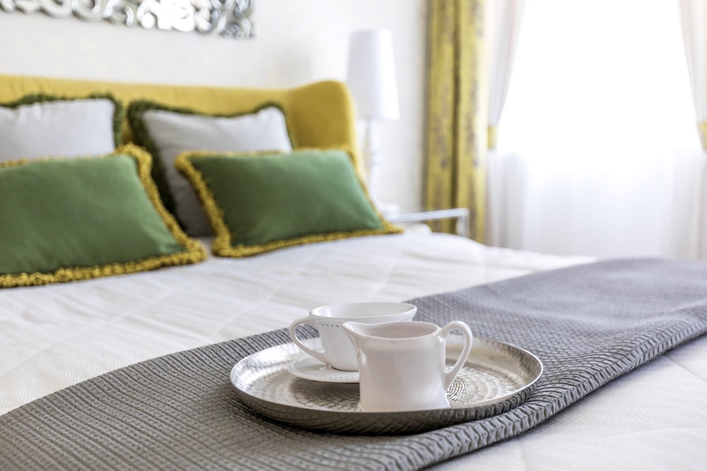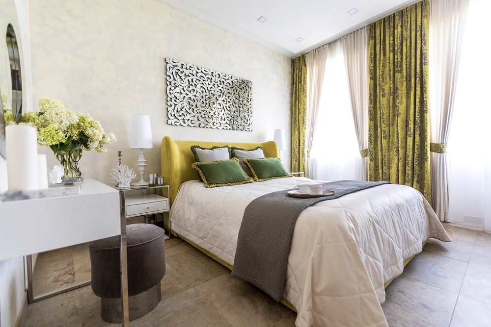 Мария Шубина, дизайн спальни, женская спальня, желтая кровать, зеркало, северная комната, спальня